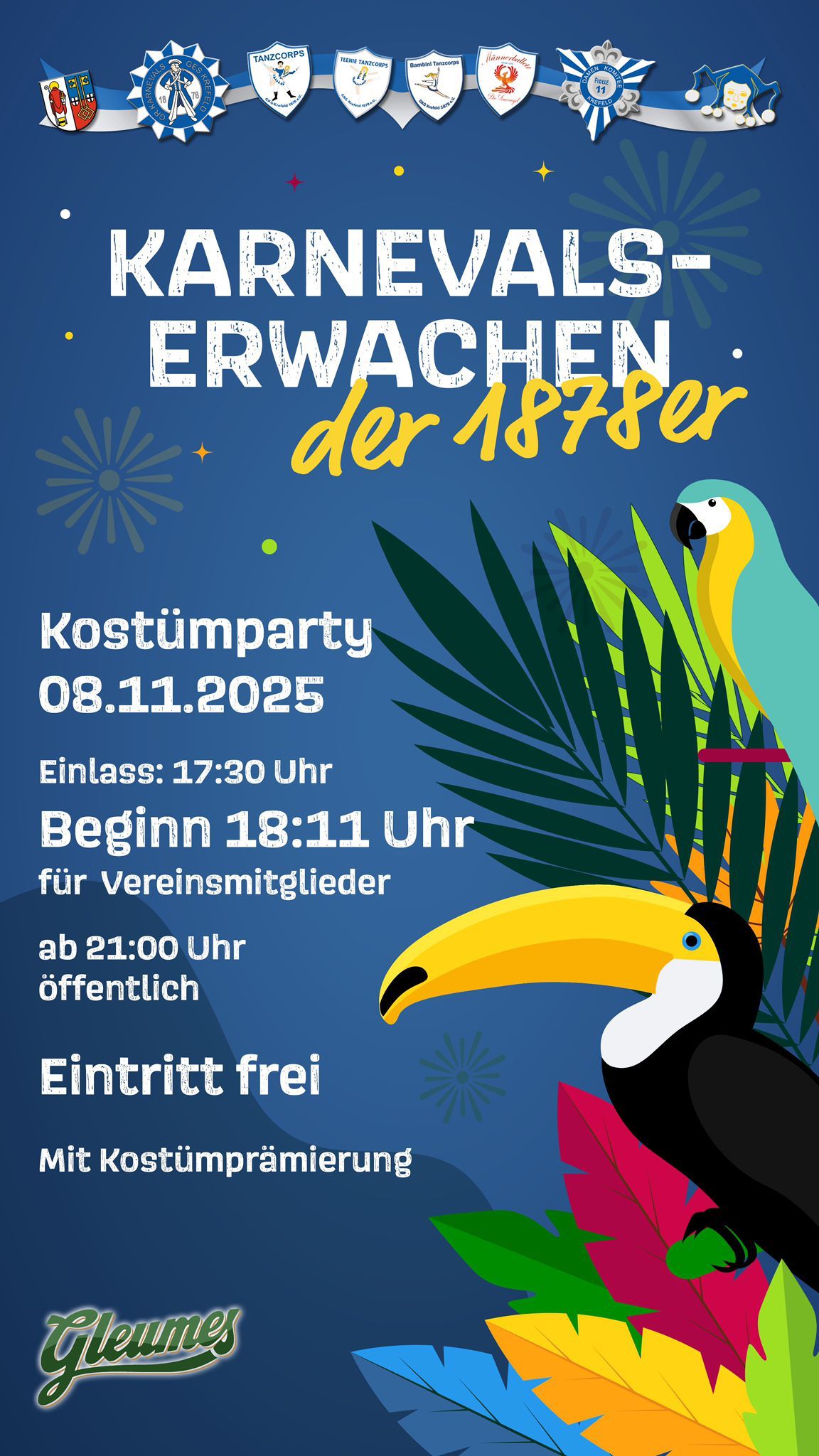 Am 08.11.2025 feiern wir in unserem Vereinslokal Gleumes das traditionelle Karnevalserwachen der Session 2025/2026.